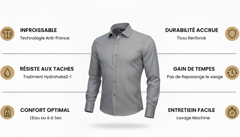 Oui, nos chemises sont conçues avec un tissu infroissable qui garde une tenue impeccable tout au long de la journée.